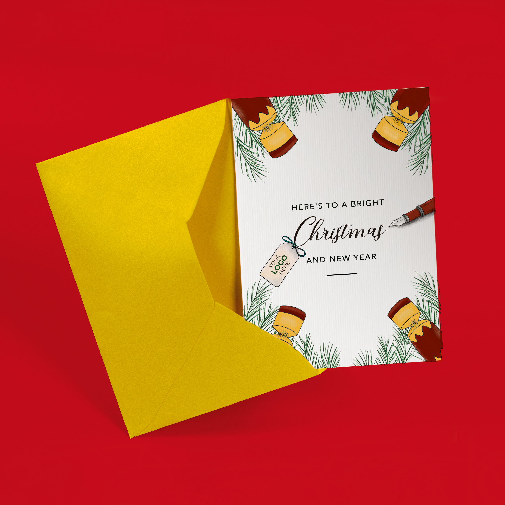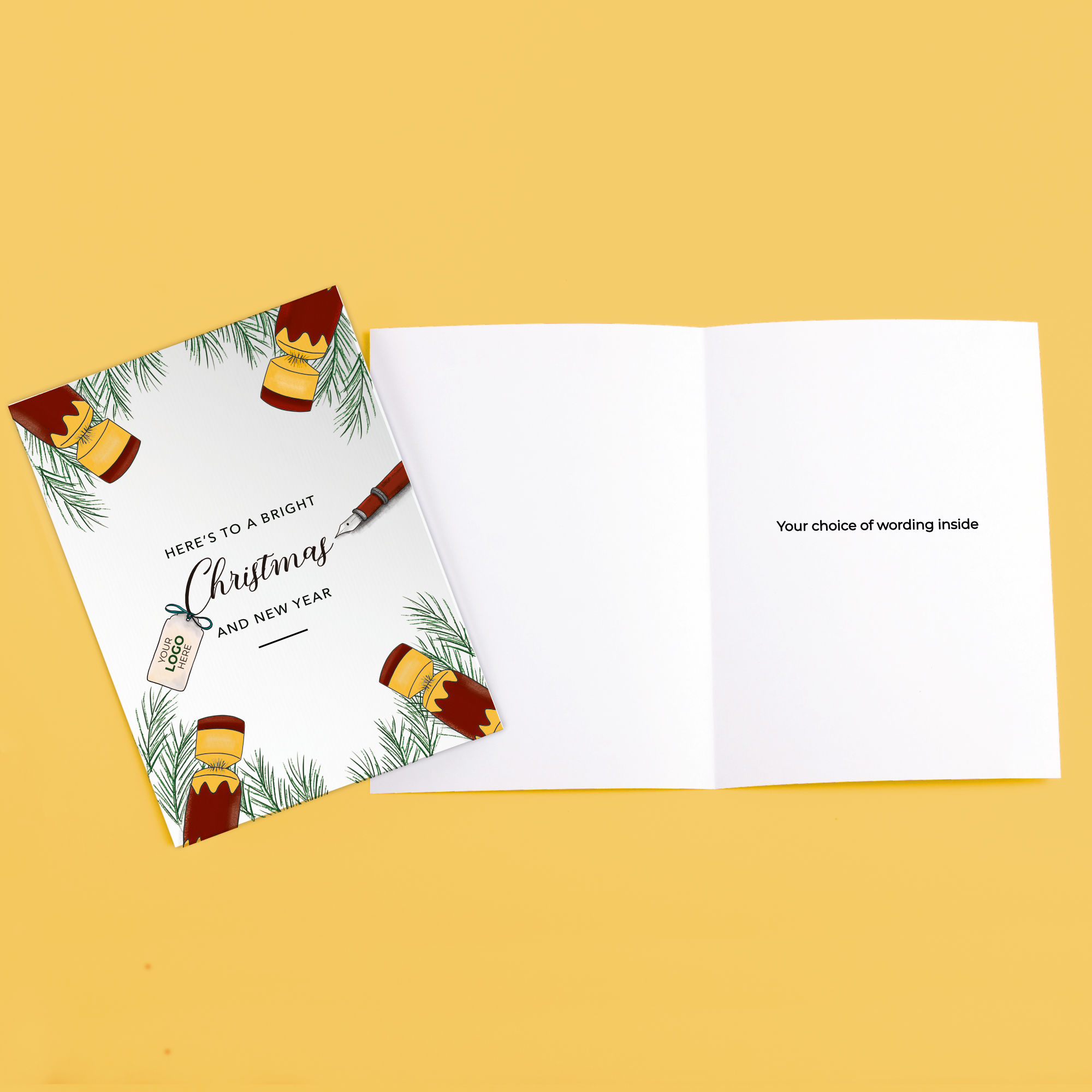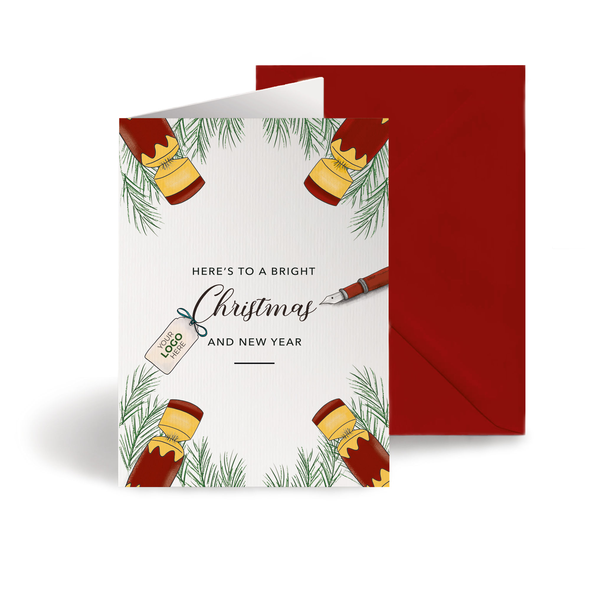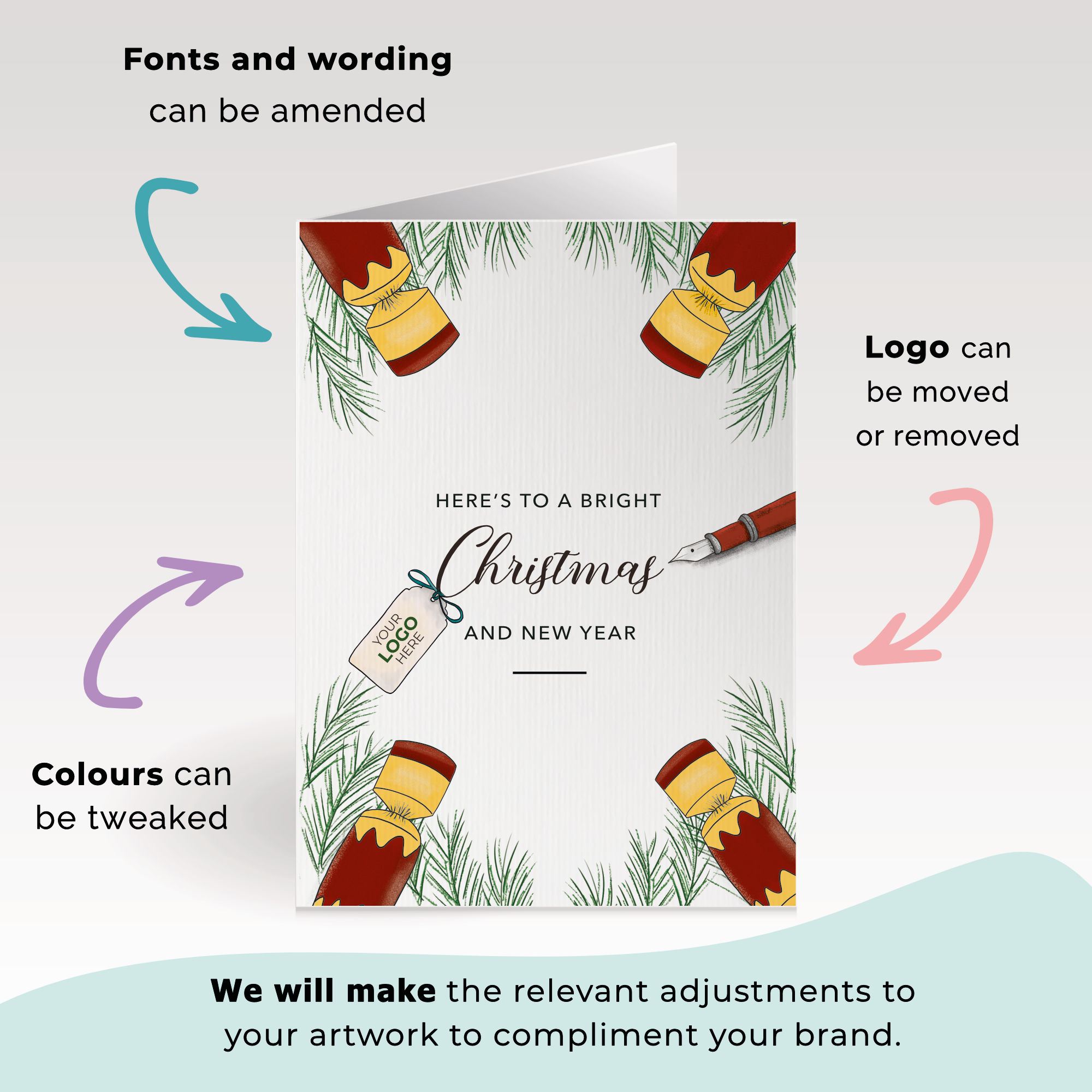 Send festive cheer with this hand-illustrated branded greeting card, featuring Christmas crackers around the perimeter and fir tree leaves, with a Christmas message on the front. The crackers can be customised to your brand colours and the wording can be changed, making it perfect for bulk corporate greeting cards to send to clients, partners, service users or staff.