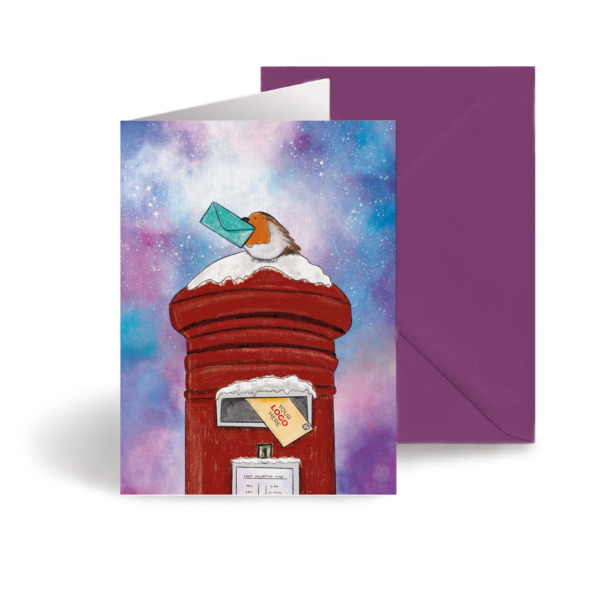 This hand-illustrated Christmas card shows an original British Post Box with a robin delivering a Christmas letter.