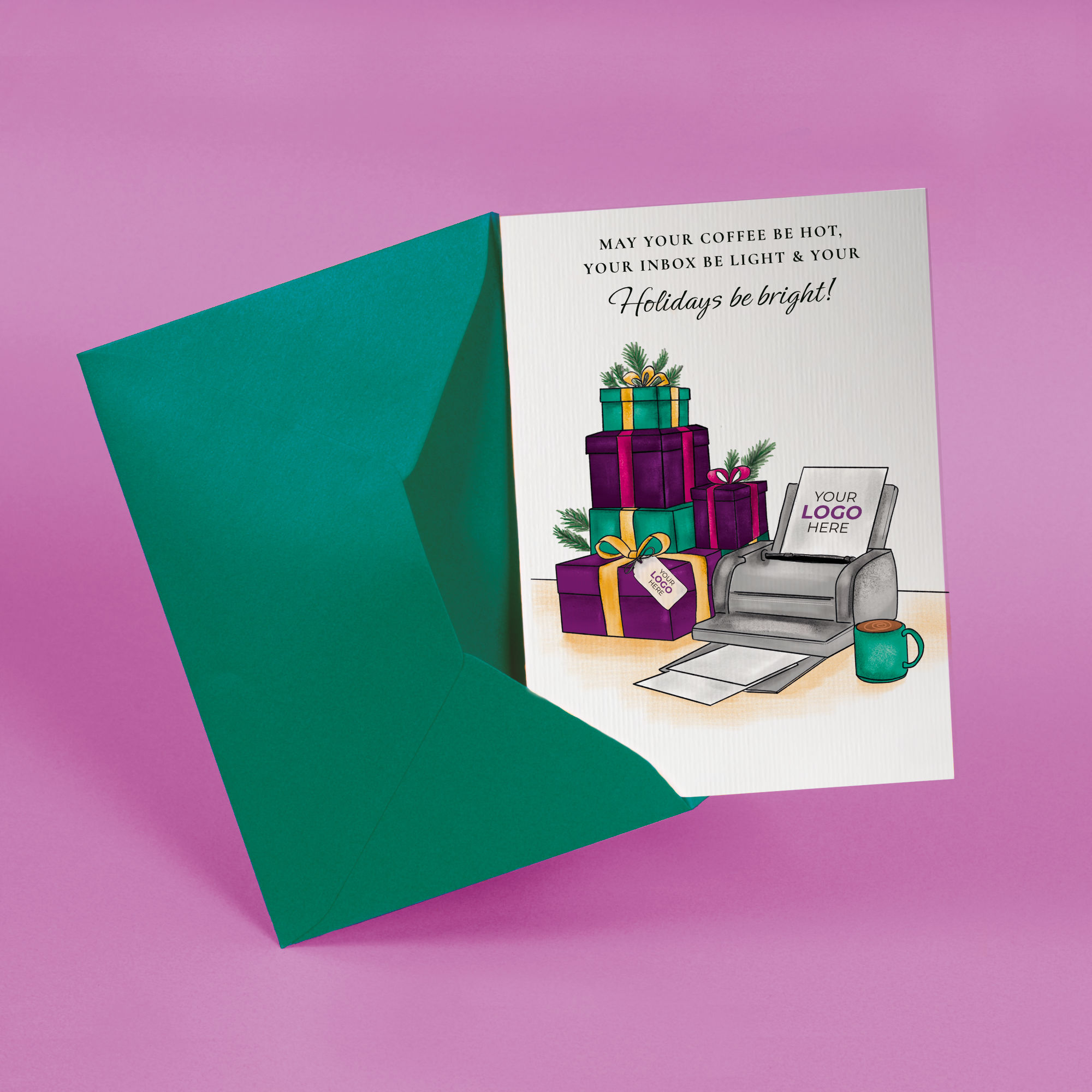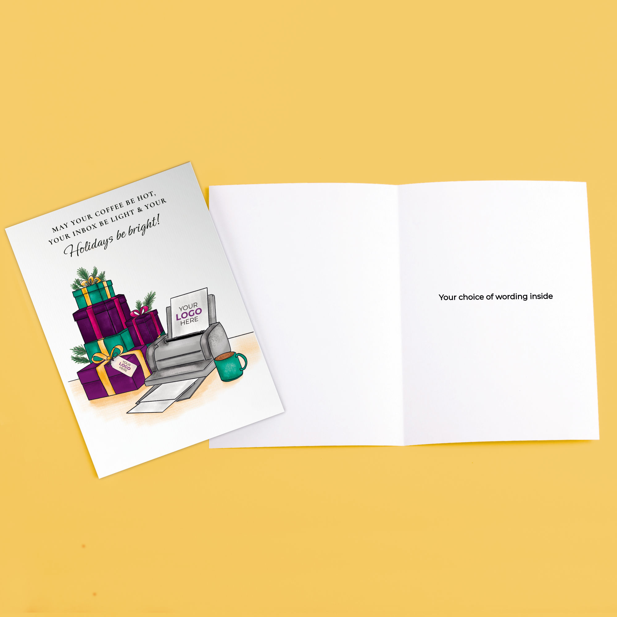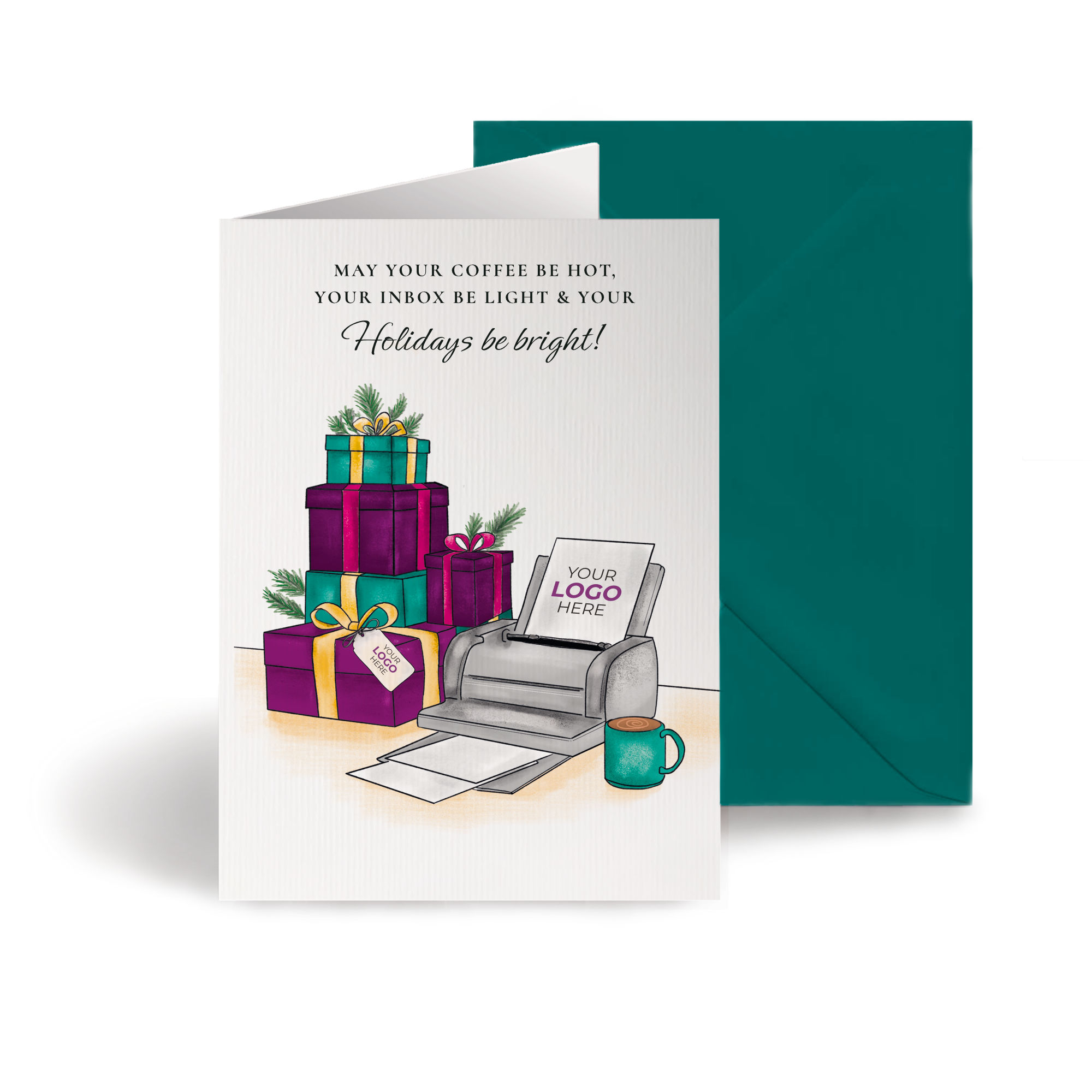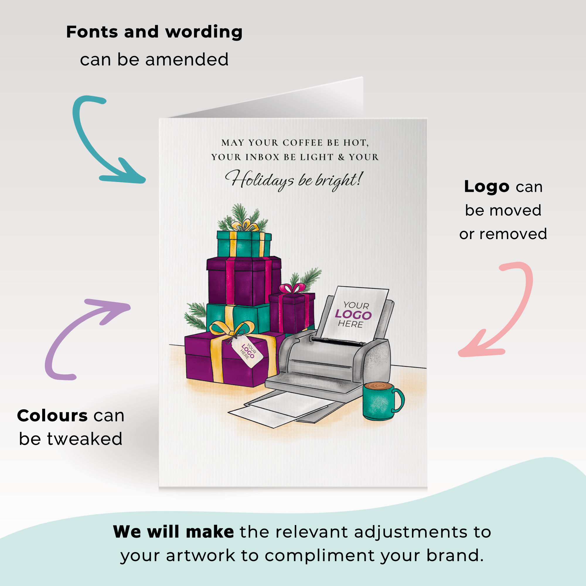 This hand-drawn company Christmas card features an office printer beside a pile of beautifully wrapped presents, complete with your company logo. A light-hearted and funny design, it’s perfect for office workers and sending personalised business Christmas cards to clients or staff. The wording reads: May Your Coffee Be Hot, Your Inbox Be Light & Your Holidays Be Bright. Presents and coffee cup can be changed to your brand colours. A memorable choice for bulk corporate christmas cards with a playful festive twist.