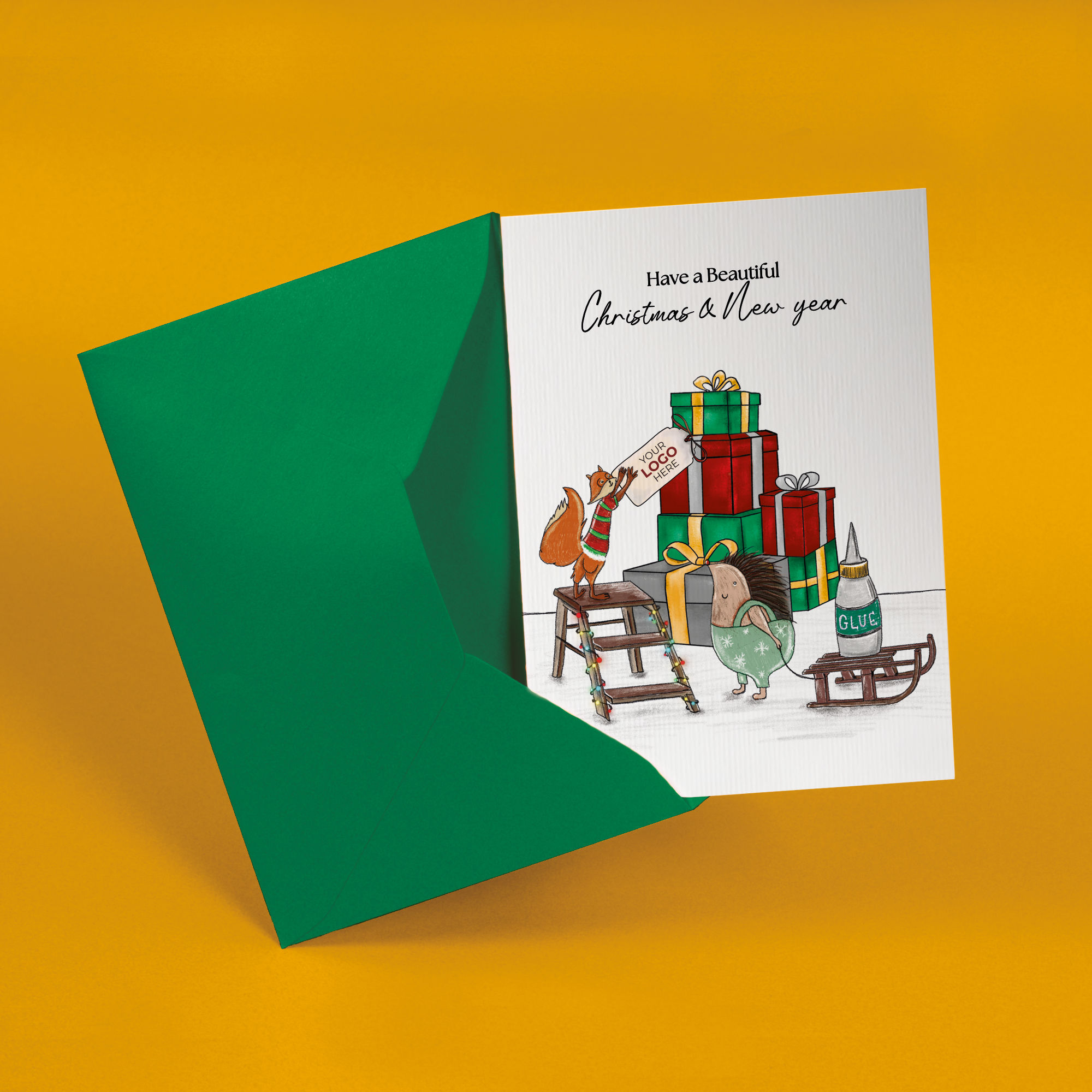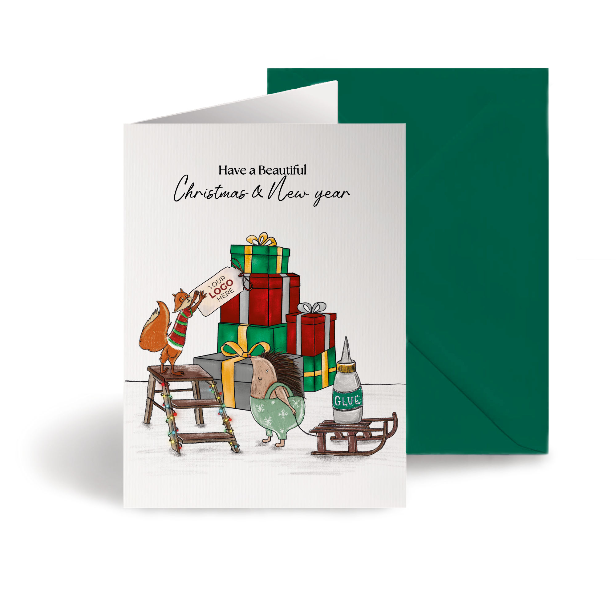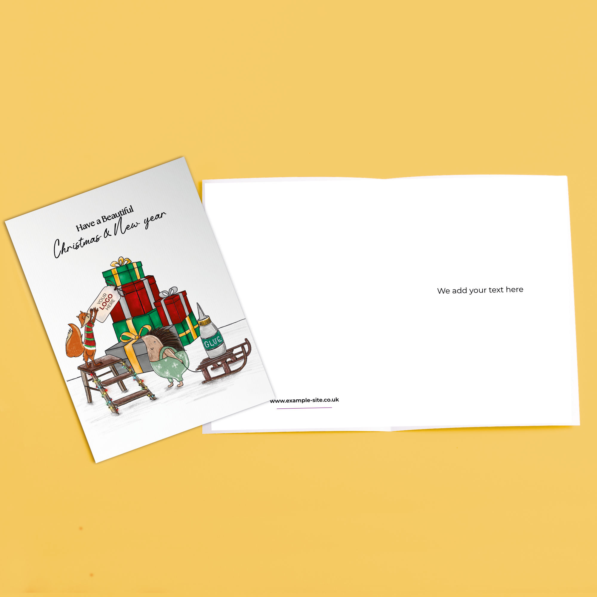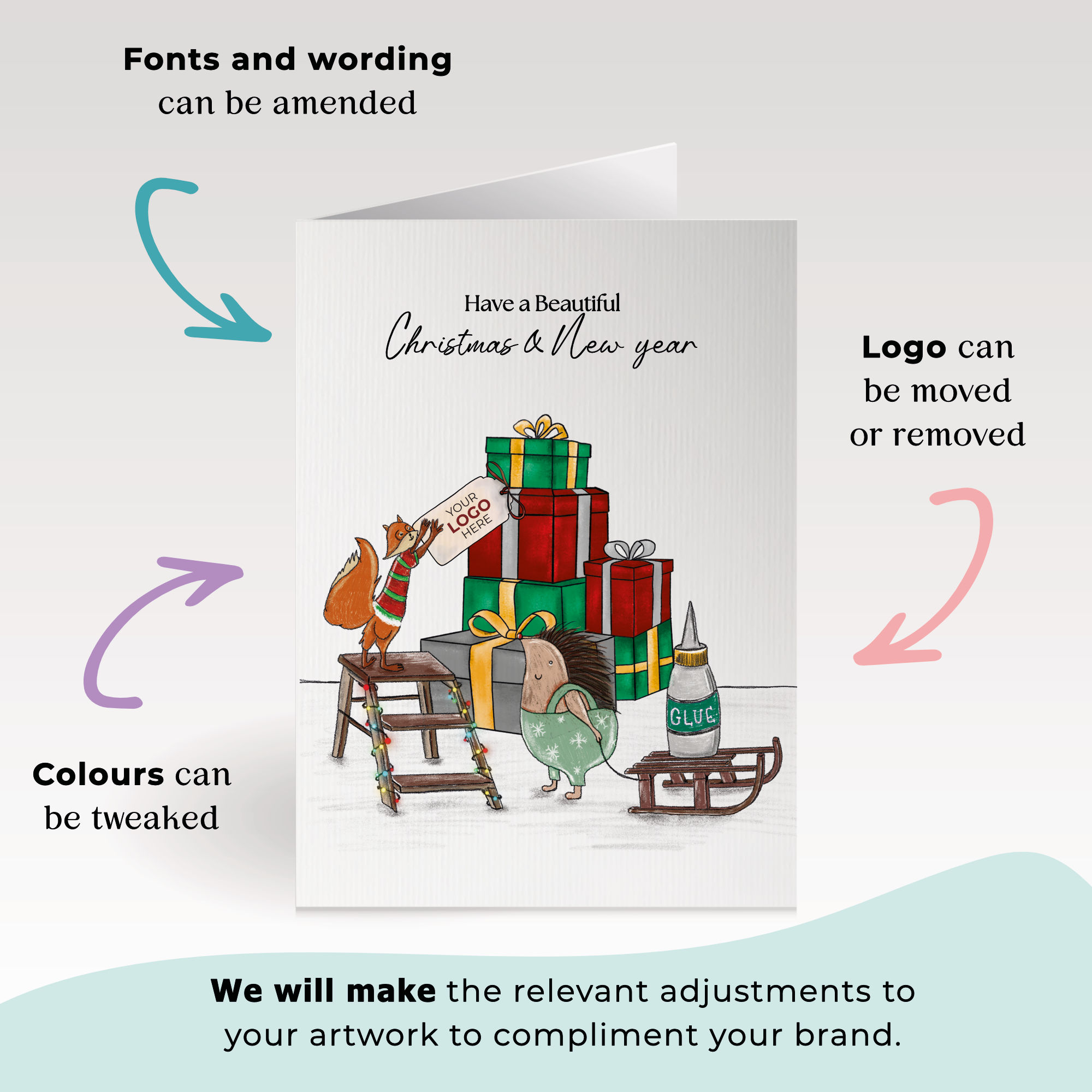 Lover of animals? This hand-illustrated card brings the wonder of the forest to your business Christmas greetings, featuring a playful squirrel and hedgehog stacking gifts. Add your logo on the gift tag and even change the wording to Season’s Greetings if preferred. A fun, memorable way to thank clients and colleagues, printed as bulk corporate greeting cards customised to your brand.